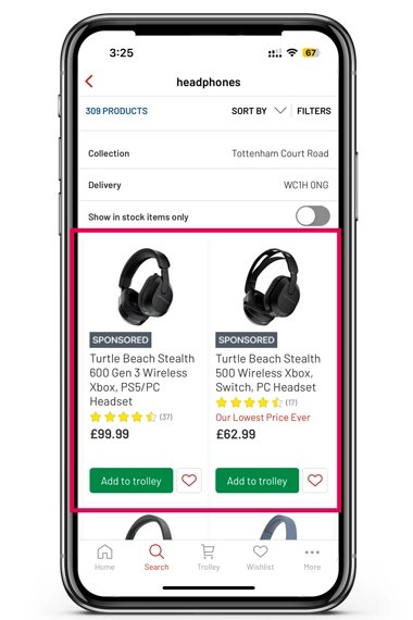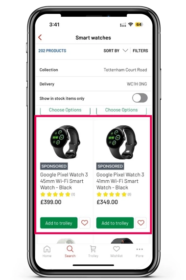Browse App placements surface sponsored products under relevant product categories on the Argos App. This placement mirrors Browse In Grid but benefits from reaching mobile‑first shoppers. With approximately 20% of Argos customer orders placed via the app, this placement offers a strong opportunity to capture mobile audiences. It operates on a CPC model, with minimum bids starting from £0.50.