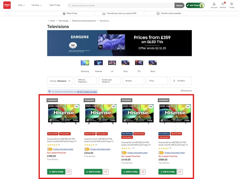 Search In Grid is one of the most popular Argos Sponsored Products placements. Clients select the most relevant search terms they want their products to appear against, with sponsored items surfacing within the top 4 search slots.